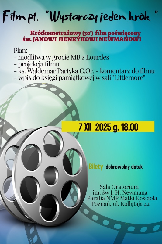 Zapraszamy do oratorium na pokaz krótkiego filmu o św. Janie Henryku Newmanie w niedzielę 7 grudnia o godz. 18.00, po którym ks. Waldemar Partyka COr. przybliży sylwetkę nowego Doktora Kościoła. Całość wydarzenia zacznie się wspólną modlitwą w grocie MB z Lourdes w intencji chorych. Szczegóły na plakacie.