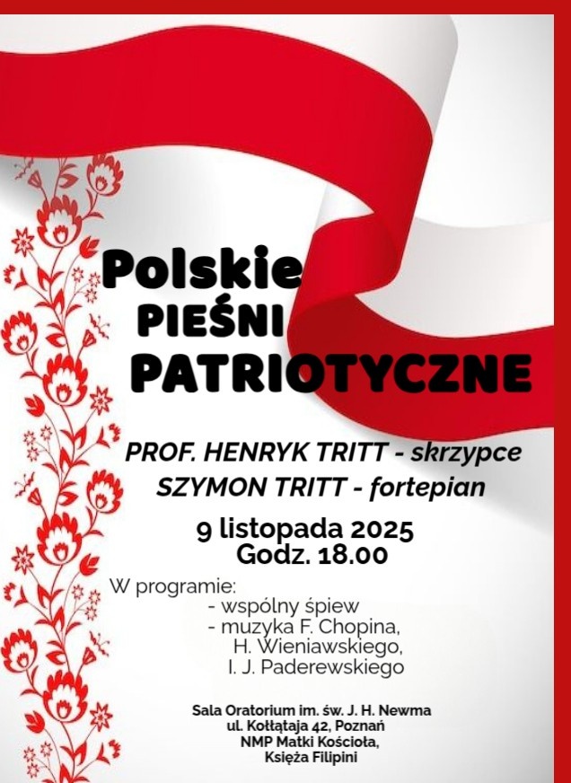 W niedzielę o godz. 18.00 zapraszamy do oratorium na wspólne śpiewanie polskich pieśni patriotycznych. Na fortepianie zagra Szymon Tritt. W trakcie spotkania wykonane będą utwory Chopina, Paderewskiego oraz Wieniawskiego, które zagra na skrzypcach prof. Henryk Tritt. Do udziału szczególnie zapraszamy dzieci i młodzież, aby tradycja polskich pieśni była przekazywana następnym pokoleniom. Szczegóły na plakacie.